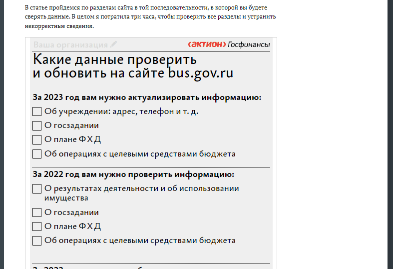 В чек-листе в статье посмотрите список информации, которую вам нужно обновить на сайте bus.gov.ru к 1 июля. Обратите внимание, что проверить необходимо данные за два года — 2022-й и 2023-й.
