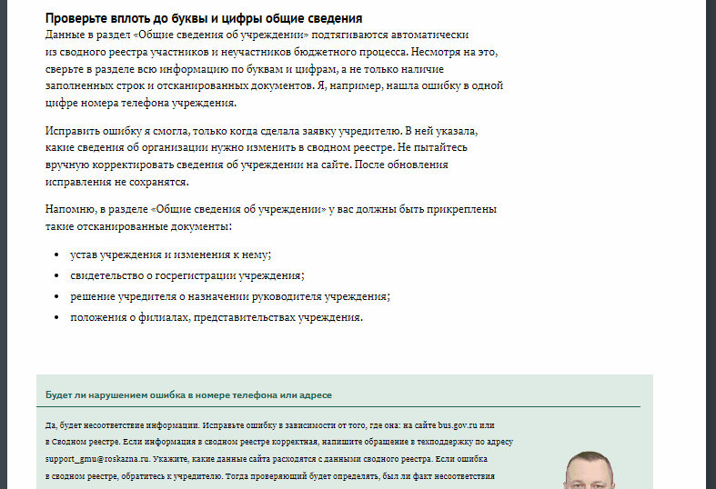 Проверьте вплоть до буквы и цифры общие сведения.Данные в раздел подтягиваются автоматически из сводного реестра участников и неучастников бюджетного процесса. Несмотря на это, сверьте в разделе всю информацию по буквам и цифрам, а не только наличие заполненных строк и отсканированных документов. Я, например, нашла ошибку в одной цифре номера телефона учреждения.