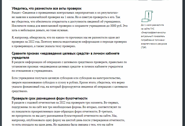 Раздел «Сведения о проведенных контрольных мероприятиях и их результатах» не заявлен к казначейской проверке на 1 июля. Но я советую проверить и его. Так вы убедитесь, что обеспечили открытость и доступность сведений об учреждении. Исключите повод для внеплановой проверки и сохраните учреждению до 5000 руб. Это хоть и небольшие деньги, но тоже нужные.